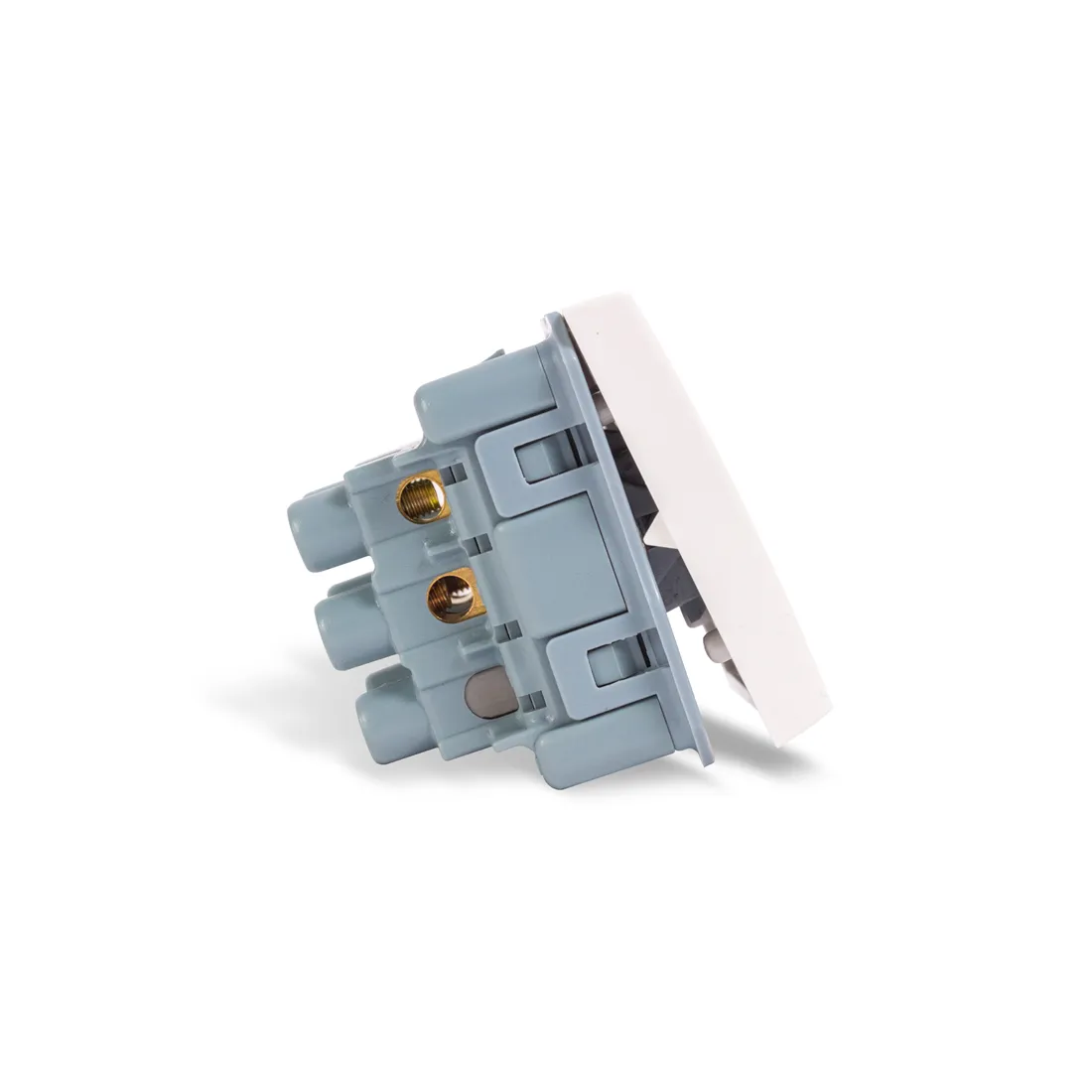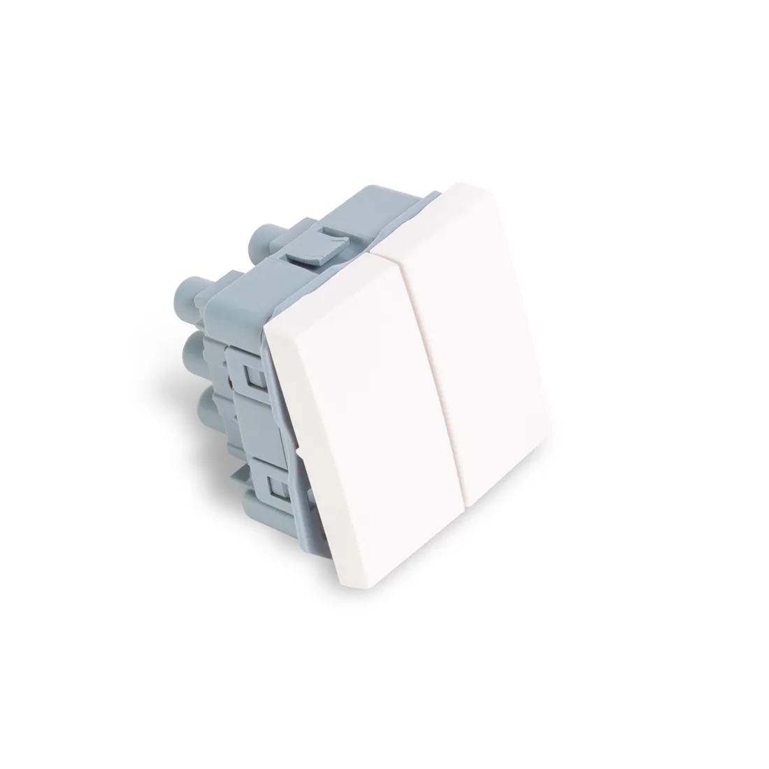 Выключатели двухклавишные устанавливаются в монтажные коробки и кабельные короба. Модуль крепится к лицевой панели с помощью защёлок. Благодаря стандартному размеру 45х45 мм, выключатели совместимы как с рамками RuVinil, так и с комплектующими других производителей, использующих данный типоразмер. Корпус выключателя изготовлен из термостойкого пластика.